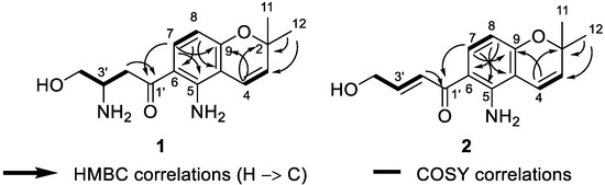Deacetylfusarochromene (1) was obtained as a yellow gum. Its molecular formula, C15H20N2O3, was deduced from the HRESI(+)MS analysis which showed a pseudo-molecular ion peak at m/z 277.1535 [M + H]+ (calcd for C15H21N2O3+ 277.1547, Δ = 4.33 ppm) (Figure S2). The resonance signals in the 1H NMR spectrum and their 1H-13C HSQC correlations exhibited two methyl groups at δH 1.40 (6H, s, H-11, H-12), two methylenes, of which one was neighbor to a ketone group at δH 3.36 (1H, m, H-2′a), 3.21 (1H, dd, J = 18.0 Hz, 8.3 Hz, H-2′b) and the other was oxygenated methylene at δH 3.82 (1H, m, H-4′a), 3.67 (1H, dd, J = 10.7 Hz, 5.5 Hz, H-4′b), five methines including one pair of ortho-coupled aromatic protons at δH 7.61 (1H, d, J = 9.0 Hz, H-7), 6.12 (1H, d, J = 9.0 Hz, H-8), one pair of cis-coupled olefinic protons at δH 6.58 (1H, d, J = 10.0 Hz, H-4), 5.65 (1H, d, J = 10.0 Hz, H-3), and one nitrogen-containing methine at δH 3.77 (1H, m, H-3′) (Table 1, Figures S2 and S5). The 13C spectrum revealed fifteen carbon signals, including one ketone at δC 198.0 (C-1′), six aromatic carbons at δC 150.2 (C-5), 112.8 (C-6), 133.9 (C-7), 106.9 (C-8), 159.9 (C-9), and 107.6 (C-10), two olefinic at δC 128.9 (C-3) and 117.1 (C-4), three hetero-bearing aliphatic carbons at δC 77.6 (C-2), 51.2 (C-3′), and 62.7 (C-4′), one further methylene at δC 38.5 (C-2′), and one methyl signal which stemmed from the two methyl carbons at δC 28.0 (C-11, C-12) (Figure S3). The 1D and 2D NMR data of 1 closely resembled those of fusarochromene (4) [20], except for the lack of signals of an acetyl group. The 1H-13C HMBC correlations of H-4 to C-2, C-9; H-11 and H-12 to C-2, C-3; H-7 to C-5, C-9; and H-8 to C-6, C-10 (Figure 2 and Figure S12) confirmed the presence of a 5-amino-chromene moiety. The continuous spin system H2-2′/H-3′/H2-4′ in the 1H-1H COSY spectrum (Figure 2 and Figure S5), and the 1H-13C HMBC correlations of H2-2′ to C-1′ suggested the arrangement of the side chain (Figure 3 and Figure S7). The 1H-13C HMBC correlation of H-7 to C-1′ revealed the connection between the chromene moiety and the side chain. In order to assign the absolute configuration of 1, we first tried the Mosher’s method. Our attempts to purify the products of Mosher’s reaction were unsuccessful due to the limited amount available. The specific rotation of 1 was negative ([α]D20 −30.0 (c 0.3, MeOH)), which was the same sign as the reported value for fusarochromene (4) ([α]D20 −14.0 (c 0.1, MeOH)) [20]. Based on this observation, the absolute configuration of C-3′ is likely R. This assumption is further supported by the biosynthetic pathway of fusarochromanone (6) [20]. Therefore, the structure of 1 was fully elucidated, as shown in Figure 1.