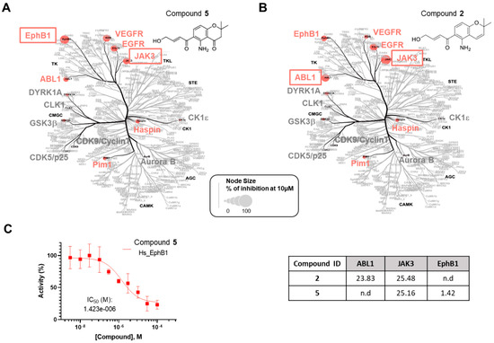 Selectivity analysis of compounds 2 and 5. The compounds 5 (A) and 2 (B) were tested in a primary screening against a panel of 14 disease-related protein kinases. Only the results obtained for 10 µM are reported on an artistic representation of the human kinome phylogenetic tree. This visualization of the human kinome was generated using Coral [27], a user-friendly web application (web application available at http://phanstiel-lab.med.unc.edu/CORAL/, accessed on 20 July 2024). Quantitative data extracted from Table S1 were encoded in node size as mentioned in the legend of the figure. The codes reported in black on this figure indicate the subclasses of protein kinases: CMGC for CDKs, MAP kinases, and GSK and CDK-like kinases; AGC for protein kinase A, G, and C families (PKA, PKC, PKG); CAMK for Ca2+/calmodulin-dependent protein kinases; CK1, casein kinase 1; STE, STE kinases (homologs of yeast STErile kinases); TKL, tyrosine kinase-like; TK, tyrosine kinases. Each kinase tested in the assay panel is written in large font; kinases colored in gray are not affected by the tested compound and kinases colored in red (“hit kinases”) are inhibited by the tested compounds. (C) IC50 (µM) for compounds 2 and 5 against the selected protein kinases. Only the curve showing the inhibition of EphB1 tyrosine kinase by compound 5 is depicted in the figure. Kinase activities reported on the graph are expressed in % of maximal activity, i.e., measured in the absence of compound 5.
