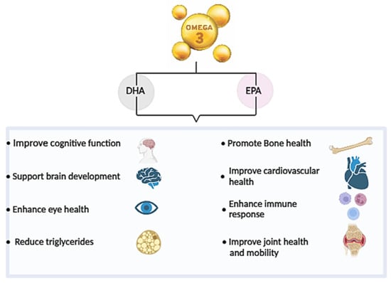 Omega-3 fatty acids are essential polyunsaturated fatty acids with a molecular structure containing multiple double bonds. They are classified based on the position of the first double bond from the methyl end (omega, ω- or n- end) of the fatty acid chain. In the case of ω-3 PUFAs, this first double bond is located between the third and fourth carbon atoms from the tail end [2]. ω-3 PUFAs, including docosahexaenoic acid (DHA C22:6 ω-3), eicosapentaenoic acid (EPA, C20:5 ω-3), docosapentaenoic Acid (DPA C22:6 ω-3), and α-Linolenic acid (ALA, C18:3 ω) offer a wide range of biological effects on human health. These effects include managing neurological disorders, cardiovascular diseases, enhancing cognitive abilities, regulating skeletal muscle mass, maintaining membrane permeability, supporting neurogenesis, aiding in eye development, reducing bone mineral density loss, combating various cancers, improving muscle function and alleviating inflammatory conditions [3,4,5,6,7,8,9,10,11] (Figure 1). A study showed that supplementation with fish oil high in EPA/DHA content (oil C) is more effective in reducing inflammation compared to regular fish oils and corn oil in C57BL/6 female mice, as it significantly decreases levels of pro-inflammatory cytokines in macrophages [12].
