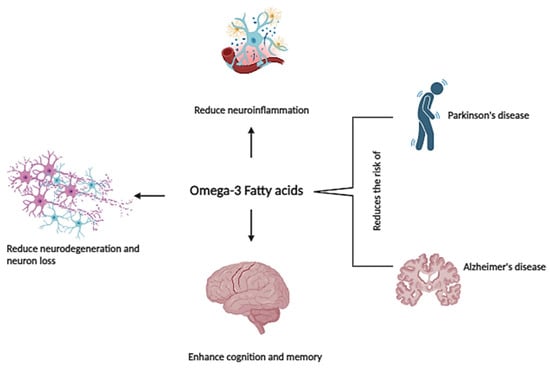 Additionally, growing evidence from studies suggests that ω-3 PUFAs offer significant neuroprotective effects against age-related neurodegenerative diseases, including Alzheimer’s disease (AD) and various forms of dementia [32,33]. AD, a progressive neurodegenerative disorder affecting millions globally, is estimated to have impacted approximately 6.5 million Americans aged 65 and older in 2021 [34,35]. While current medications provide some relief for mild-to-moderate symptoms, they lack the ability to slow disease progression. Mounting evidence suggests a potential therapeutic role for ω-3 PUFAs in age-related AD [36]. Deficiency in ω-3 PUFAs has been linked to an increased risk of AD and depression in older adults (>75 years old) [37], while supplementation with EPA and DHA has shown potential in improving cognitive function and reducing AD risk in healthy women over 60 [38].