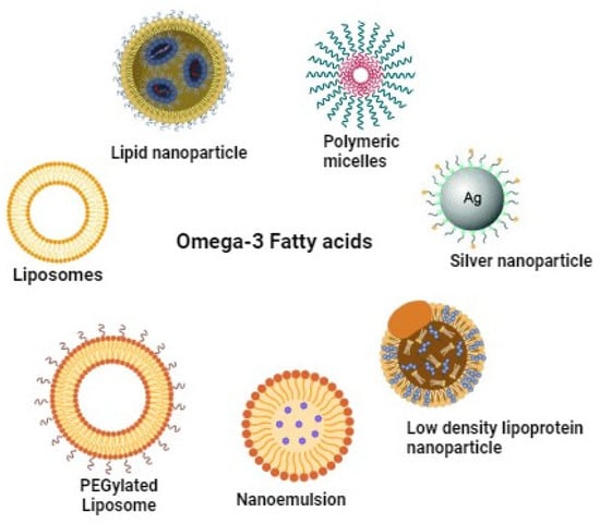 Recent advancements in oil-in-water emulsification and encapsulation offer promising strategies to enhance the stability of fish oil rich in EPA and DHA against oxidative damage from free radicals, oxygen, and metal ions [206,207,208]. Nano encapsulation involves encapsulating bioactive compounds in nanoparticles (NPs) to create stable formulations (Figure 4). The utilization of NPs in the delivery of ω-3 PUFAs represents a cutting-edge approach in Nano biotechnology, utilizing nanometric materials sized between 1 and 100 nm to enhance the bioavailability and stability of these essential nutrients [209]. The unique properties of NPs, such as their solubility, high surface-to-volume ratio, and strength, are instrumental in enhancing drug-delivery efficiency and effectiveness. [210]. Thus, Nano encapsulation technology enhances the poor solubility of omega-3 fish oil by facilitating the formation of a micelle network or by minimizing interactions with other substances [211]. This approach prevents colour changes, masks undesirable flavours, enables controlled release of minerals, ensures product stability during production and storage, and improves product characteristics [212]. Additionally, the controlled and sustained release of contents from nonencapsulated bioactive substances improves their solubility in water and increases their availability for biological activities [213]. Research also indicates that the size of nanoemulsion droplets positively influences the bio-accessibility of encapsulated bioactive chemicals, enhancing the digestibility of the lipid phase [214]. Therapeutic and diagnostic nanoparticles fall into two main categories: organic (e.g., liposomes, micelles, polymers) and inorganic (e.g., gold, iron oxide). Organic nanoparticles are employed in diagnostic procedures, imaging techniques, and photothermal therapy [215]. Inorganic nanoparticles are significant in preclinical studies, including cancer imaging and treatment [216], drug delivery, magnetic targeting, and treating anaemia. Nanoparticle encapsulation of ω-3 PUFAs shows promise in treating various conditions such as improving cognition, reducing inflammation, managing diabetes, and treating brain injuries, as outlined in Table 8.