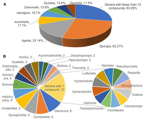 Number of new diterpenoids isolated from each genus of sponges from 2009 to 2022. (A) Overview of diterpenoid distribution across all genera, with those having fewer than 10 compounds grouped. (B) Close-up of genera with fewer than 10 diterpenoids each.