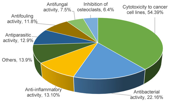 The most frequently reported activity was cytotoxicity against tumor cells, with 54 molecules showing this activity, accounting for 39% of the activity entries and 24% of all reported molecules (Figure 2). The number of compounds with antibacterial activity ranked second, with 22 molecules, among which 6 had antituberculosis activity. The numbers of molecules with anti-inflammatory, antiparasitic, antifouling, antifungal, and osteoclast-inhibitory activities were 13, 12, 11, 7, and 6, respectively. Among the 12 molecules with antiparasitic activity, 9 were active against Plasmodium species, whereas 3 were active against the leishmaniasis parasite. The activities of 13 molecules were categorized as other types, including radiation sensitization activity, antioxidant activity, inhibitory activity against specific target proteins such as Casitas B-lineage lymphoma proto-oncogene-b (Cbl-b), antiviral activity, and so on.