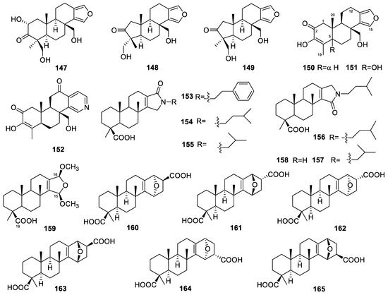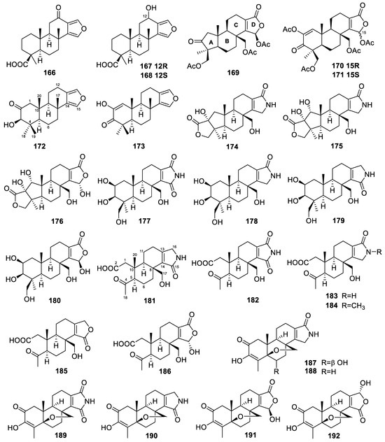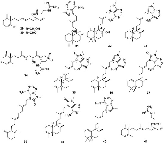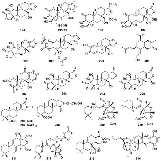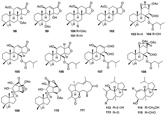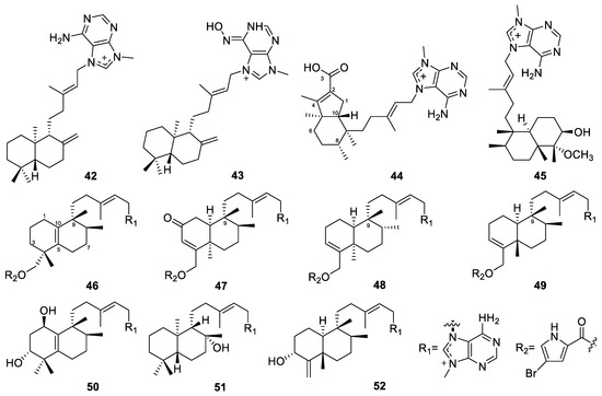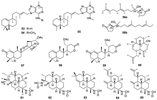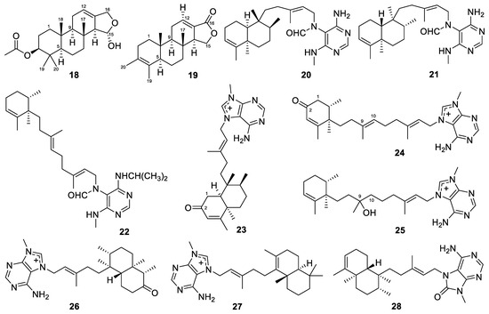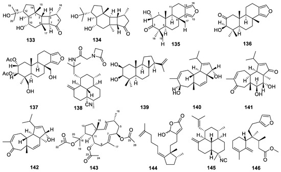 We have consistently focused on the diterpene compounds derived from marine sources. In our review of marine-derived diterpenes, we found that fungi and sponges are primary sources of these compounds. Previously, we summarized the diterpenes from marine fungi [13]. Here, we provide another review focusing on the diterpenes from marine sponges.