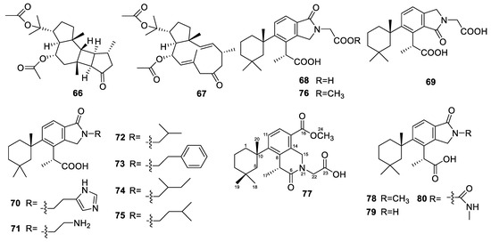 There have been some reviews on the separation, structural elucidation, and biological activity evaluation of diterpenoids. From 1984 to 2009, Hanson James R. published a series of reviews on newly discovered diterpenes every year [8,9,10,11]. Since 2011, Hanson began publishing reviews on diterpenoids from terrestrial sources [12]. Reviews on diterpenoids from marine sources are relatively fewer.