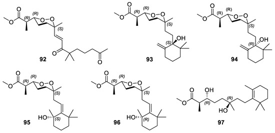 - Yang, F.; Zou, Y.; Wang, R.P.; Hamann, M.T.; Zhang, H.J.; Jiao, W.H.; Han, B.N.; Song, S.J.; Lin, H.W. Relative and absolute stereochemistry of diacarperoxides: Antimalarial norditerpene endoperoxides from marine sponge Diacarnus megaspinorhabdosa. Mar. Drugs 2014, 12, 4399–4416. [Google Scholar] [CrossRef] [PubMed]