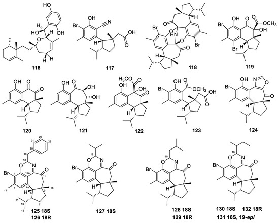 | 124–125, 127–128,130 | Hamigerans M–Q | Hamigera tarangaensis | Cytotoxicity against the HL-60 cell line, with IC50 values of 6.9, 19.5, 14.7, 21.3, and 33.3 µM, respectively | [46] |