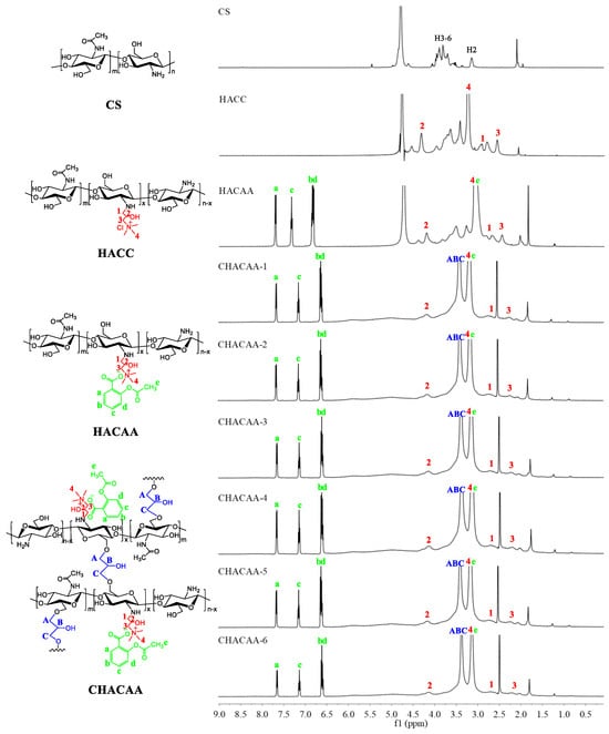 1H NMR spectra of CS, HACC, HACAA, and CHACAA (the dissolving reagent of CS, HACC, and HACAA is D2O, and the dissolving reagent of CHACAA is DMSO-d6).