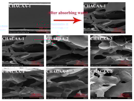 The pore structures of CHACAA hydrogel films formed after the freeze-drying process were assessed visually using SEM analysis (Figure 2). Before water absorption, the CHACAA-1 hydrogel film was uniform and compact. In contrast, the hydrogel films exhibited a 3D microporous structure after absorbing water, with the macropores being flat in shape and ranging in size from 100 to 400 μm. This is because the water molecules infiltrate into the hydrogel films and enter the space between crosslinked HACC molecular chains, allowing the molecular chains to stretch out as far as possible. However, due to the connection of the crosslinking points, the HACC molecular chain will not break. The hydrogel films will swell and present obvious pores in the interior, and eventually show a highly interconnected porous construct. These interconnected pores create a favorable environment for the effective loading of drugs into the hydrogel films, and significantly affect the flow and release of the drugs.