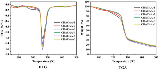 The thermal properties of CHACAA hydrogel films were investigated by TGA and DTG curves, and the results are shown in Figure 3. The samples showed three-step degradation processes in range from 40 °C to 500 °C []. The first stage was observed from 60 °C to 140 °C, attributed to the loss of absorbed water and connected water in hydrogel films. At this stage, the changes in CHACAA 1-2 were slightly more obvious than those in CHACAA 3–6. The second phase of weight loss was in the range of 160 °C to 260 °C, which was due to the destruction of the hydrogel network structure by breaking the crosslinks (-CH2CH(OH)CH2-). It could also be found that different CHACAA hydrogel films exhibited different thermogravimetric behavior at this stage, that is, the maximum weight loss rates of the hydrogel films gradually decreased with the increase in acetylsalicylic acid content. Another weight loss was seen at around 270 °C, which was attributed to the decomposition of the remaining molecules of HACAA. The above observations were consistent with the findings reported by Li et al. []. Significantly, CHACAA-2, CHACAA-3, and CHACAA-4 reached the highest temperature (267 °C) at the maximum weight loss rate, indicating that these hydrogel films possessed the best thermal stability after the crosslinking reaction.