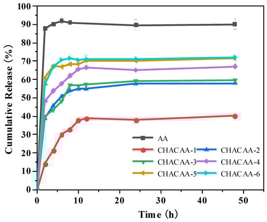 Since the CHACAA hydrogel films are intended to be prepared as medical material for tissue engineering, bio-adhesives, and wound dressing patch applications, the in vitro drug release experiment was performed at pH 7.4 to simulate the normal environment of bodily fluids. The graph of the cumulative percentage of drug release after some hours is depicted in Figure 4. The in vitro release of uncoated acetylsalicylic acid exhibited a “burst effect”, which might become the source of shortened action time, multiple and repeated dosing, and increased cytotoxicity of the liver and kidneys. CHACAA hydrogel films, by contrast, showed an obvious sustained release effect, and all hydrogel films followed the same pattern based on two different phases: the first phase consisted of a burst release up to 2 h, while the second phase corresponded to a sustained release process up to 24 h or even more. This phenomenon is in accordance with the literature results []. For example, Xu et al. investigated the release behavior of acetylsalicylic acid from the chitosan/β-sodium glycerophosphate/gelatin hydrogels. They found that the prepared hydrogels underwent an initial burst release phase followed by a sustained slow release stage []. According to the analysis, the burst release phenomenon was mainly caused by two reasons. On the one hand, AA molecules adsorbed on the surface of hydrogel films or that interacted weakly with CHACC could release in a short time, driven by the diffusion effect. On the other hand, hydrogel films could form hydrogen bonds when exposed to buffer solution, facilitating the free diffusion of the covered drug set in the most superficial regions []. In the sustained release stage, the drug was embedded in the hydrogel because of electrostatic attraction, so it took a long time for AA to be released through the gel layer in the medium. Of course, the test hydrogel films released acetylsalicylic acid in a different manner at different rates. CHACAA-1 had a sustained drug release effect, but the cumulative release of AA was only 40.11 ± 1.60% at 48 h. This behavior was mainly attributed to the strong interaction between the positively charged CHACC and the negatively charged AA. As for CHACAA-5 and CHACAA-6, the burst release was obvious due to the high content of acetylsalicylic acid and they were not an ideal choice for drug delivery materials. An obvious cumulative release related to the release of more than 50% of the drug in the first 12 h was observed for CHACAA-2, CHACAA-3, and CHACAA-4. Thenceforth, the AA release profiles converted to a slow-release step, in such a way that about 60% of the loaded drug was freely released within 48 h. Hence, they had advantages of controlling drug release and prolongating drug action time, and presented broad application prospects in the fields of controlled drug release materials.