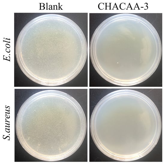 Gram-positive bacteria (Escherichia coli ATCC 25922) and gram-negative bacteria (Staphylococcus aureus CMCC(B) 26003) were chosen as model bacteria to evaluate the antibacterial activity of CHACAA hydrogel films, while a blank group without a hydrogel sample was the control group. It could be intuitively seen from Figure 5 that a large number of bacterial colonies were formed on the agar plates of each strain in the control group. After being treated with CHACAA hydrogels, almost no bacteria survived on the culture dishes, indicating that CHACAA hydrogels maintained high antibacterial activity, and the antibacterial rate could reach 100%. This remarkable inhibition behavior is mainly due to the fact that positively charged quaternary ammonium groups can interact with the negatively charged bacterial biofilm through electrostatic adhesion and efficiently damage the bacterial biofilms []. (Note: since no new colonies were formed on the petri dishes treated with all hydrogel films, only the photographs of bacterial colonies of the blank group and one group of samples are shown in Figure 5 for convenient observation.)