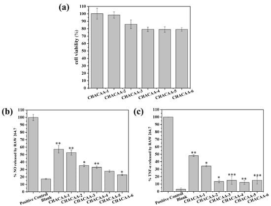 Persistent chronic inflammation delays the body’s healing process and induces pain. In particular, the presence of bacterial infections leads to progressive destruction of tissue due to the accumulation of inflammatory cells and the secretion of excessive inflammatory cytokines []. Therefore, an adequate reducing inflammatory response is highly necessary. Here, the anti-inflammatory activity of CHACAA hydrogel films was established by measuring the effect on the release of NO and TNF-α from RAW 264.7 cells. The cytotoxicity test, of course, was first performed with this cell line in order to avoid false inflammatory activity produced by the death of the cells. The cytotoxicity results were depicted in Figure 6a. In the presence of CHACAA-1 and CHACAA-2, the viability of RAW 264.7 cells remained at ~100%, a fact which clearly indicates the lack of cytotoxicity. With the increase in acetylsalicylic acid content, the treated groups had a decrease in the percentage of viable cells. Among them, the survival rates of RAW 264.7 cells treated with CHACAA 4–6 dropped to ~80%. Nevertheless, the cell viability of all hydrogel samples remained at satisfactory values, higher than 80%, which indicated that the in vitro anti-inflammatory activity could continue to be evaluated.
