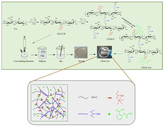 Firstly, hydroxypropyl trimethylammonium chloride chitosan quaternary ammonium salt (HACC) was obtained and the synthesis process was followed by the previous methods []. Then, 2.0 g of HACC was sufficiently dissolved in 100 mL of deionized water in a 250 mL round-bottomed flask with mechanical stirring, and the pH value of the solution was adjusted to 10 by adding 5% sodium hydroxide solution. Subsequently, 4 mL of epichlorohydrin was added for the cross-linking reaction. The pH of the reaction mixture was maintained at about 10 during this period. After the reaction for 4 h at 70 °C, the pH of the reaction system was adjusted to 7 by adding 10% hydrochloric acid solution. After that, the reaction solution was purified after dialysis with distilled water for 2 days to eliminate the residual reagents, and the crosslinked quaternized chitosan hydrogel solution (CHACC) was obtained. The acetyl salicylate solution in varying proportions (the molar ratio of CHACC to acetyl salicylate in CHACA-1 was 1:0.75, CHACA-2 was 1:1, CHACAA-3 was 1:1.25, CHACAA-4 was 1:1.5, CHACAA-5 was 1:1.75, CHACA-6 was 1:2) was added to the solution and stirred magnetically for 1 h, until well mixed. Afterwards, 0.2 mL of glycerol was added and stirred continued for 12 h. The solution was then ultrasonically defoamed with an ultrasonic cleaner for 30 min. Finally, the hydrogel solution was poured into a Teflon sheet mold and dried at 40 °C for 48 h to obtain the CHACAA hydrogel films. The detailed preparation method of CHACAA was shown in Scheme 1.