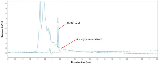High-performance liquid chromatography (HPLC) chromatogram showing the separation profile of standard gallic acid and S. polycystum extract, used to compare retention times and assess the presence of phenolic compounds.