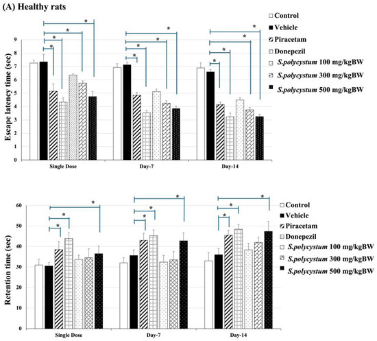 The results are shown in Figure 2. In healthy conditions (before Rt. MCAO surgery), rats that received the vehicle displayed a significantly increased escape latency, but decreased retention time (p < 0.001 for both measures, compared to the control group). Rats that received a S. polycystum extract at doses of 300 and 500 mg/kg BW showed a significant decrease in escape latency time (p < 0.05, all; compared to the vehicle group). Additionally, only the high dose of S. polycystum extract significantly increased retention time (p < 0.05, compared to the vehicle group) on days 1, 7, and 14. Under cognitive impairment conditions (after Rt. MCAO surgery), rats that received S. polycystum extract at doses of 300 and 500 mg/kg BW showed a significant reduction in escape latency time on day 1 (p < 0.05, all; compared to the vehicle group) whereas only the high dose showed a significant reduction throughout the study period (p < 0.05, all; compared to the vehicle group). On the other hand, the dose of 300 mg/kg BW showed a decreased retention time throughout the study period (p < 0.05, all; compared to the vehicle group). Interestingly, both positive treatments, including piracetam and donepezil, displayed a significant reduction in escape latency and a significant improvement in retention time (p < 0.05 for both measures, compared to the vehicle group).