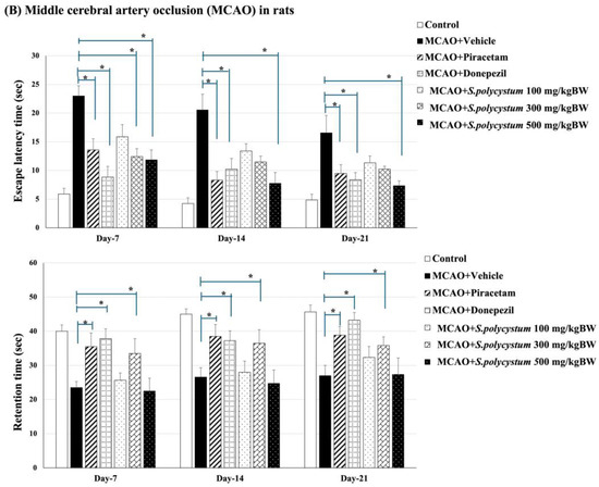 Effect of S. polycystum extract on spatial memory in rats, as assessed using the Morris water maze test. Each column and bar represent a mean value ± S.E.M. (n = 8/group). * p-value < 0.05 compared to the vehicle group. (A) Cognitive-enhancing effect of the extract by MWT test in healthy rats; (B) Cognitive-enhancing effect of the extract by MWT test in the MCAO stroke model.