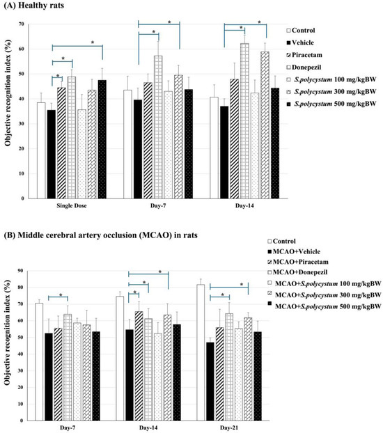 We evaluated the percentage of the object recognition index under two conditions: a healthy condition and an ischemic stroke condition. The data is shown in Figure 3. Under the healthy condition, we performed NOR test on single dose, day 7, and day 14. The rats that received an S. polycystum extract at a dose of 500 mg/kg BW saw a significantly enhanced recognition index in the single-dose test (p < 0.05, compared to the vehicle group). On day 7 and day 14, only a medium dose (300 mg/kg BW) showed an increase in the objective recognition index (p < 0.05 for all; compared to the vehicle group). After Rt. MCAO implementation, we found that rats that received a S. polycystum extract at a dose of 300 mg/kg BW saw an increase of the percentage for the objective recognition index on day 14 and day 21, compared to the vehicle group (p < 0.05 for all; compared to the vehicle group). In addition, rats that received the positive drugs, including piracetam and donepezil, also showed a significant increase in the objective recognition index throughout the study.