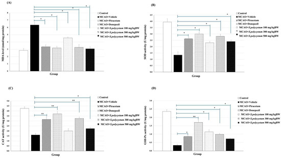 Effect of S. polycystum extract on oxidative stress status. Each column and bar represent a mean value ± S.E.M. (n = 8/group). ** p-value < 0.01, * p-value < 0.05, compared to the vehicle group. (A) Effect of the extract on the level of malondialdehyde (MDA) in the hippocampus; (B) Effect of the extract on the activity of superoxide dismutase (SOD) in the hippocampus; (C) Effect of the extract on the activity of catalase (CAT) in the hippocampus; and (D) Effect of the extract on the activity of glutathione peroxidase (GSH-Px) in the hippocampus.