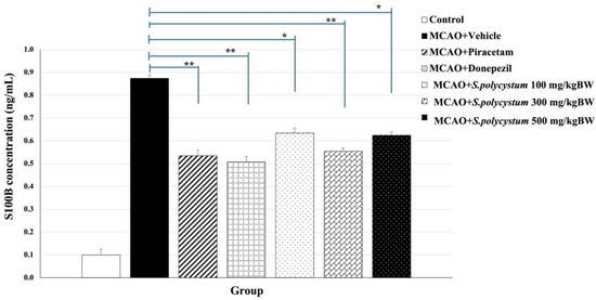 Effect of S. polycystum extract on a concentration of serum S100B. Each column and bar represent a mean value ± S.E.M. (n = 8/group). ** p-value < 0.01, * p-value < 0.05, compared to the vehicle group.