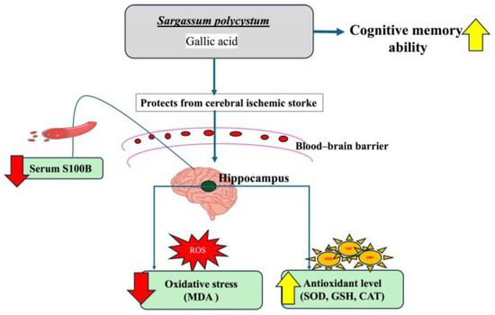 In addition, this study emphasized that S. polycystum extract contained a high amount of gallic acid, which is an important phenolic compound. Several scientific studies report that the neuroprotective effects of gallic acid alleviate cognitive deficits by improving cerebral antioxidant defenses [35] due to its capacity to cross the blood-brain barrier, directly reduce high levels of ROS and RNS, and chelate transition metal ions [13,36]. Moreover, gallic acid could modify the polarization of microglia and attenuate cerebral ischemia/re-perfusion-induced blood-brain barrier injury [37]. Thus, the possible underlying mechanism of S. polycystum extract in enhancing cognitive memory might involve the phenolic compounds, particularly gallic acid, which possesses antioxidant and neuroprotective activities as mentioned earlier. However, other bioactive compounds in S. polycystum, such as carotenoids, are also reported to regulate oxidative stress and neuroprotective activity [12,38]. These compounds may also contribute to the improved antioxidant activity, which in turn influences the overall effect of S. polycystum.