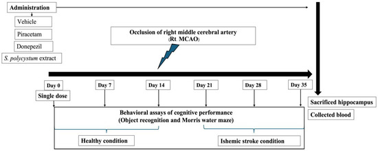 Our data demonstrated that S. polycystum improved spatial memory by showing a decreased escape latency time and increased retention time in the Morris water maze test. Additionally, recognition memory, as evaluated by the novel object recognition test, increased. The cognitive enhancement effects of S. polycystum exhibited continuously before and after the MCAO operation throughout the study period. Therefore, S. polycystum extract has the potential to prevent and alleviate cognitive decline. These cognitive abilities are reported to be associated with the hippocampus, because it is an important structure responsible for cognitive functions, not only in episodic memory but also in processing speed, working memory, and executive function [21].