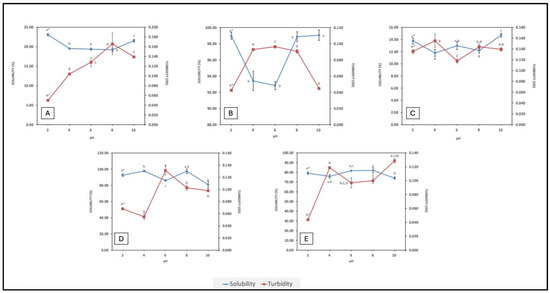 Solubility vs. turbidity profiles of FPHs: (A) BWPH-A: blue whiting protein hydrolysate A; (B) BWPH-B: blue whiting protein hydrolysate B; (C) SPH: sprat protein hydrolysate; (D) HPH: hake protein hydrolysate; (E) MPH: mackerel protein hydrolysate. Error bars are expressed as mean ± SD (n = 3). * Different letters in a category indicate significantly different means (p < 0.05).