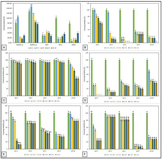 Foaming capacity and stability (%) of FPHs measured over a pH range of 2–10; (A) Foaming capacity; (B–F) Foaming stability (%) of FPHs: BWPH-A: blue whiting protein hydrolysate A; BWPH-B: blue whiting protein hydrolysate B; SPH: sprat protein hydrolysate; HPH: hake protein hydrolysate; MPH: mackerel protein hydrolysate. Error bars are expressed as mean ± SD (n = 2). * Different letters in a category indicate significantly different means (p < 0.05).