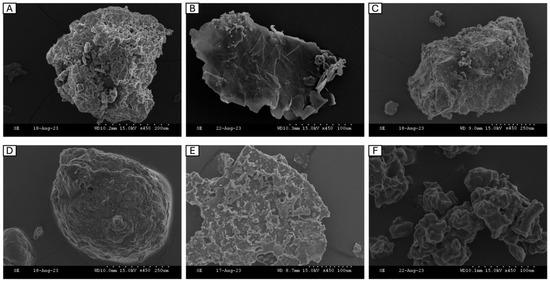 Scanning electron microscopy of FPHs: (A) blue whiting protein hydrolysate A (BWPH-A), (B) blue whiting protein hydrolysate B (BWPH-B), (C) sprat protein hydrolysate (SPH), (D) hake protein hydrolysate (HPH), (E) mackerel protein hydrolysate (MPH), (F) Soy peptone hydrolysate (Soy-PH). Magnification: 450×.