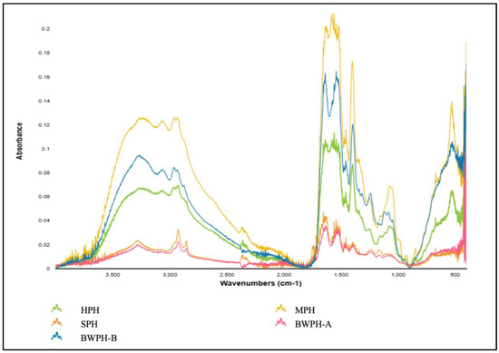 Proteins undergo a variety of structural changes during hydrolysis and drying procedures, which can be reflected in the distinctive infrared absorption bands, also known as the amide bands [53]. These changes are caused by the AAs and peptide chains that comprise the secondary structure of protein, which can be detected using fourier transform infrared (FTIR) spectroscopy. The main absorption bands exhibited by proteins in the IR region are namely amide A (3500–3300 cm−1), amide I (1800–1600 cm−1), amide II (1470–1570 cm−1) and amide III (1400–1250 cm−1), which help determine their secondary structure. Additional bands include those representing the N-terminal (NH3+, ~1510 cm−1) and the C-terminal (COO−, ~1400 cm−1) that provide further information on the structure. Figure 4 illustrates the FT-IR spectra of the FPHs produced in this study.