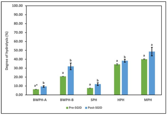 DH is used as a measure to study the extent of enzymatic hydrolysis in terms of the conversion of proteins into peptides. It offers an insight into the influence of enzyme type and concentration, as well as reaction parameters, on the number of free amino groups generated, which are then compared to the total amino groups in the intact protein. The FPHs that were supplied by Biomarine Ingredients Ireland Ltd. (Monaghan, Ireland), including BWPH-A, BWPH-B, and SPH, were produced under proprietary industrial conditions. Combinations of enzymes such as Alcalase, Flavourzyme, Corolase, neutrase, Endocut-01, and Endocut-02 were utilised for their generation at concentrations ranging from 0.1 to 1%. For the in-house FPHs, Flavourzyme was used to generate HPH, whereas Alcalase was used for the production of MPH, in a reaction time of 4 h. It is also worth revisiting that BWPH-A and SPH are partially hydrolysed insoluble fractions, which has a direct effect on their %DH. The %DH values of each hydrolysate before and after SGID are displayed in Figure 5.