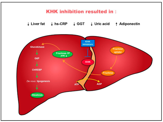 KHK is a key-limiting enzyme in fructose metabolism that catalyzes the phosphorylation of fructose into fructose-1-phosphate. The rapid metabolism of fructose via this pathway contributes to lipogenesis and ATP depletion, thereby promoting metabolic syndrome and NAFLD [8,9,10]. More recently, it has been demonstrated that KHK-C promotes endoplasmic reticulum stress, further exacerbating liver disease in both diet-induced and genetic murine models of NAFLD [65]. The importance of KHK for fructose-related metabolic diseases has promoted the development of KHK inhibitors that are now being assessed in clinical trials. One such inhibitor is PF-06835919 [32]. Excessive intake of fructose has been associated with an increased risk of cardiometabolic syndrome and cardiovascular disease [66].
