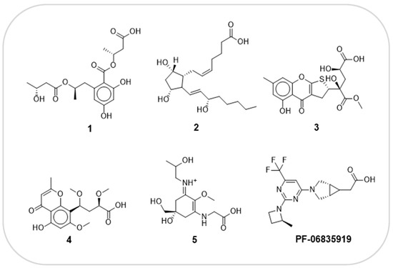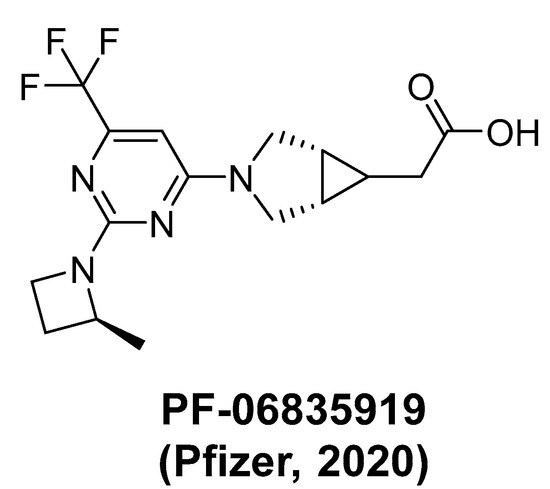 Potent pyrimidine and indazole derivatives against KHK were reported through high-throughput screening and fragment-based drug design [23,25,26,27,28]. These compounds were further optimized via structure-based drug design, revealing fundamental interactions within KHK’s active site [25]. X-ray crystallography confirmed their binding, with some inhibitors achieving submicromolar potency and significant inhibitory activity against KHK [25]. Recent advances in KHK inhibitor development have focused on novel structural motifs and modifications to known inhibitor classes. Researchers have explored various chemical scaffolds, including pyrimidine/cyanopyridine [29], sulfinates [30], and saturated monocyclic heterocycles [31]; some have demonstrated good bioavailability and good pharmacokinetic profiles in preclinical studies, making them promising candidates for further development. Despite the progress in developing small-molecule KHK inhibitors, translating KHK inhibitors into clinical success has been challenging. Several inhibitors, such as Pfizer’s PF-06835919 (Figure 2) [32], showed initial promise [33] but were discontinued after Phase II trials without the reason’s disclosure. Eli Lilly’s inhibitors LY3478045 and LY3522348 faced similar issues [34,35], demonstrating that achieving sufficient efficacy and safety profiles remains a primary challenge in clinical development.