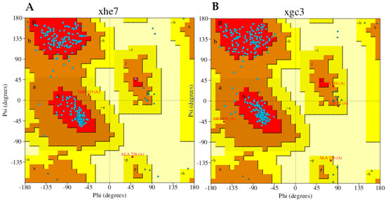 Ramachandran plot. (A). Energy Pre-minimized KHK. (B). Energy minimized KHK. Details about the coloring of the plot can be interpreted from the PDBSum generated server.