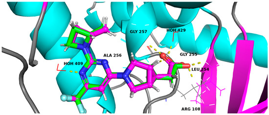 Comparison of binding poses of the co-crystallized ligand (magenta) and the redocked ligand (green) within the KHK binding site, with an RMSD of 0.3004 Å.