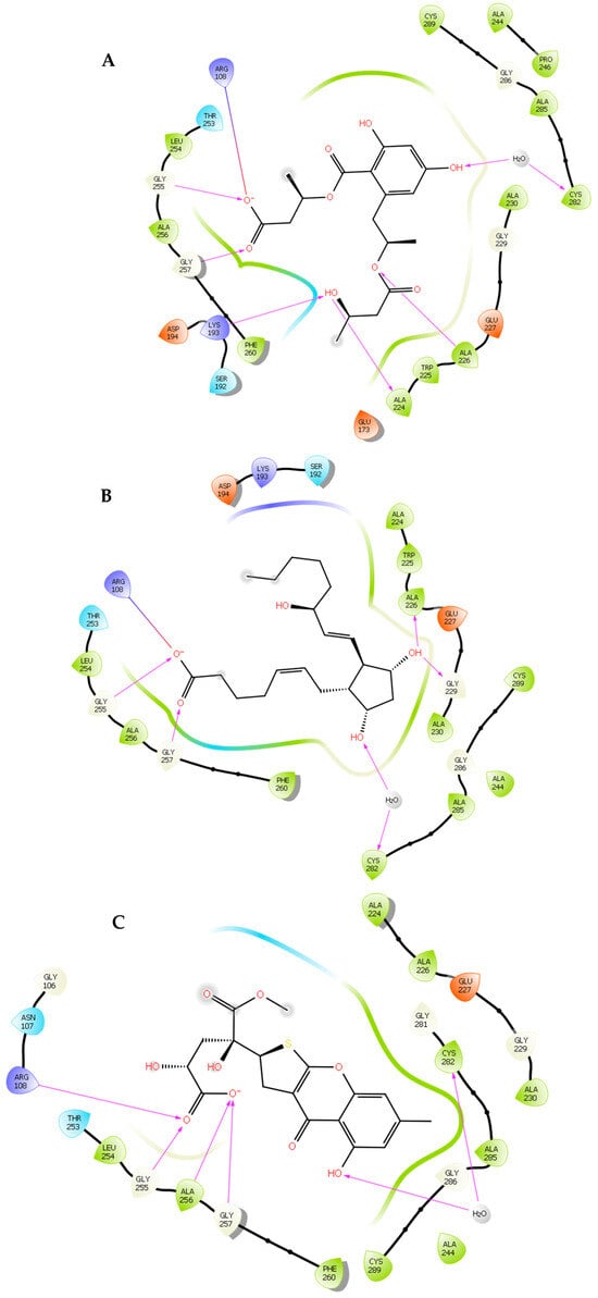 The findings presented in Table 1 offer valuable insights into the binding affinities and interaction profiles of the selected hit compounds with the target enzyme KHK. The application of induced-fit docking (IFD) was crucial in generating accurate complex structures for these hits, allowing for the identification of true binders that might have been initially overlooked due to poor scores (false negatives). This was accomplished by employing multiple receptor conformations obtained through the IFD protocol rather than relying on a single rigid conformation, thereby enhancing the reliability of the screening process [52]. Compound 1 exhibited significant polar interactions, a high docking score, and binding affinity. (1) The carbonyl oxygen group occupancy of the ATP-ribose pocket with the oxygen atom filling a small but crucial sub-pocket defined by Phe-260 (normally filled by the methylene of the ATP ribose sidechain); (2) a hydrogen-bonding interaction between the para hydroxyl group and a conserved water that forms a hydrogen bond with the backbone CO of Cys-282; (3) the primary alcohol and the ester oxygen groups filling the hydrophobic pocket defined by the Lys-193, Ala-224, and Ala-226 residues; (4) one of the oxygen atoms of the carboxylate group was well-positioned to interact with the cationic guanidinium group of Arg-108 (distance= 2.37 Å). In addition, the backbone NH of Gly-255 and Gly-257 and (5) the aromatic core provides rigidity and enhances binding affinity by reducing the entropy loss upon binding [52]. Compound 2 exhibited comparable key amino acid interactions, a high docking score, and binding affinity to 1; (1) an ionic bond between the oxygen atoms of the carboxylate group and Arg108, the backbone NH of Gly-255 and Gly-257; (2)two hydroxyl groups of the cyclopentane ring formed strong hydrogen bonds with Ala-226 and Gly-229, and conserved water that forms a hydrogen-bond with the backbone CO of Cys-282. Similar interactions with key amino acid residues were observed for 3, 4, and 5. These interactions support their relatively high binding affinity and docking scores. Favorable binding-based 2D and 3D docking positions interact with key residues within the binding pocket, as shown in (Figure 6 and Figure 7).
