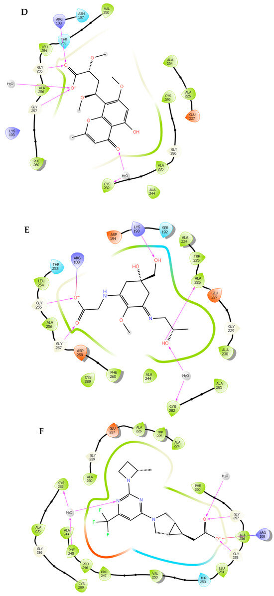 Two-dimensional ligand–protein binding interactions of KHK bounded to the top five hit candidates and control. (A). Compound 1. (B). Compound 2. (C). Compound 3. (D). Compound 4. (E). Compound 5. (F). PF-06835919.