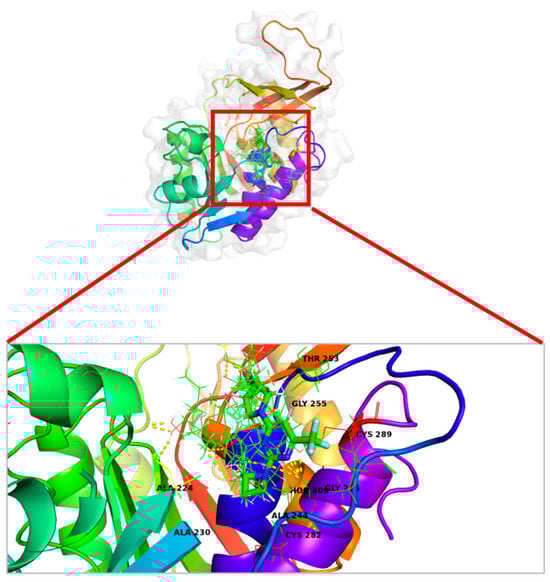 The ligand was docked using the Glide tool without constraints [85], employing a van der Waals (vdw) radius scaling factor of 0.80 and a partial charge cut-off of 0.15. The ligands’ flexibility was considered, while the protein was considered a rigid structure, with all other parameters set to their default values. GlideScore, implemented in Glide, was utilized to predict binding affinity and rank ligands. The Pose Rank was utilized to identify the optimal docking pose for each ligand. Subsequently, the compounds were thoroughly examined based on their binding scores and a detailed analysis of all binding interactions.