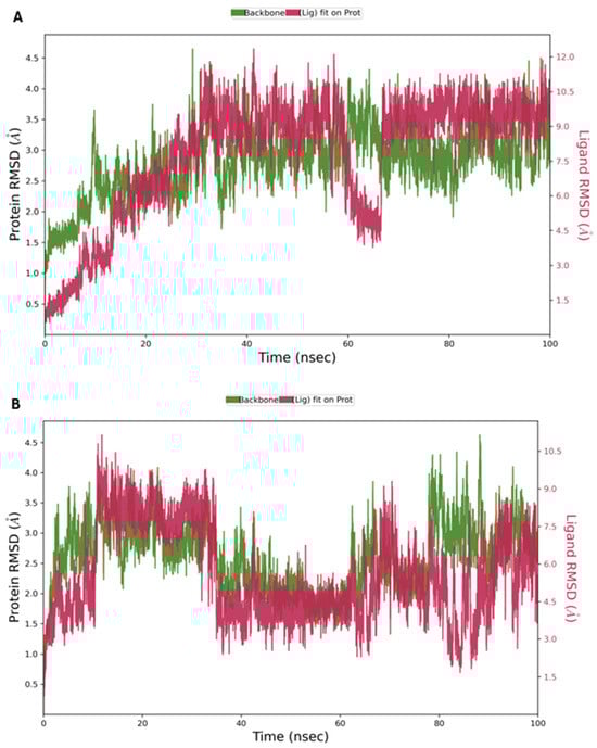 Based on the initial docking and MM-GBSA results, 1 and 2 were chosen for further analysis by MD perturbation. In the MD study, the KHK RMSDs were equilibrated between 30 and 100 ns and maintained below 4.0, signaling that they formed stable complexes [54] with 1 and 2 (Figure 8A,B). Interestingly, the RMSDs of 1 and 2, in reference to the KHK backbone (Lig Fit Prot), showed that the ligands remained at the receptor binding site throughout the analysis [55] (Figure 8A,B).