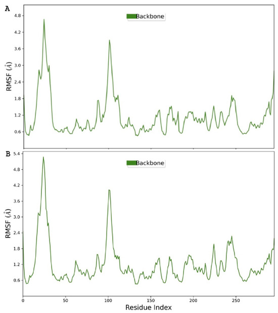 To further assess the structural components of KHK for considerable deformations during the analysis, its root mean square fluctuations (RMSFs) were considered [56]. When assessed in complexes with either 1 (Figure 9A) or 2 (Figure 9B), KHK experienced the highest oscillations (RMSF 4.2–5.2 Å) on amino acid residues between 0 and 50 and then at about 95–105, depicting that these residues were freely flexible [57]. However, none of these showed relevance in maintaining the ligand–receptor complex (Figure 10), while most of the backbone structure remained relatively rigid (Figure 9) and played an important part in interacting with ligands (Figure 10).