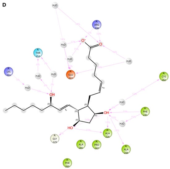 The prominent interactions that significantly contributed to the established binding poses of 1 and 2 to 6W0Z included a mixture of hydrogen bonds (with or without water bridges), as well as hydrophobic, and ionic interactions (Figure 10). Consistently, Ala-226 established the highest hydrogen bond interaction with both ligands (Figure 10A,B), while Glu-227 participated mainly through the water bridge-mediated hydrogen and ionic interactions (Figure 10C,D). Further water-bridge-assisted hydrogen bonding could be seen with Ala-244, Phe-245, Thr-253, and Cys-282, involving both ligands (Figure 10A–D). The direct ionic interactions with Arg-108 were obtained for both ligands, where it was most significant for 1 (19%) than 2 (5%) (Figure 10C,D). Some hydrophobic amino acid residues, such as Pro-247 and Phe-260, were in very close proximity to induce significant hydrophobic interactions with 1, while 2 relied on Pro-247 and Ala-285 for this interaction. In general, the MD results were in agreement with the initial docking results (Figure 6 and Table 1).
