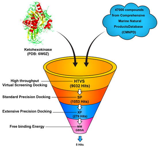 The present in silico study focused on exploring molecules from natural marine organisms as selective inhibitors of ketohexokinase (KHK). Two drug design strategies were employed: structure-based drug design (SBDD) and ligand-based drug design (LBDD) [44]. Initially, molecular docking was used to identify the top-docked compounds [45], followed by induced-fit docking (IFD) [46], molecular mechanics generalized Born and surface area continuum solvation (MM-GBSA) [47], and molecular dynamics simulations to validate their binding affinities [48]. A shape-based screening was also conducted to assess shape similarities [49]. ADMET studies were conducted to evaluate the pharmacokinetic properties of the potential KHK inhibitors [50]. The findings of this study have the potential to contribute significantly to the ongoing efforts to enhance the biological activity of hit compounds against ketohexokinase (KHK).