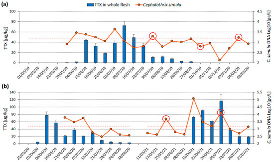 Time series of TTX concentration in M. gigas whole flesh (blue bars, primary y-axis) and C. simula DNA abundance in seawater (orange dots, Log10 values on a secondary y-axis) at a single location in (a) May 2019 to March 2020; (b) spring/summer 2020 and 2021. Red circles highlight the days with increased sediment content in seawater samples and red dashed lines show Log10 value of 3.2 (1600 genomic copies (gc)/L). TTX was measured in M. gigas on all dates specified on the date (x) axis, while C. simula DNA was measured on all days when seawater samples were taken (orange dots, n = 40). COVID-19 restrictions prevented seawater sampling in May and June 2020.