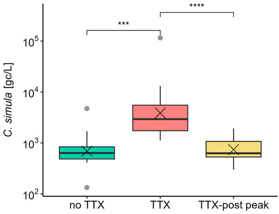 After confirming C. simula DNA in our study area, a quantitative assay was applied to measure its abundance in seawater samples. The group analysis revealed significantly higher C. simula DNA abundance in seawater when TTX accumulated in M. gigas (“TTX” group), compared to periods of TTX absence in oysters (“no TTX”) or following the last TTX concentration peak (“TTX-post peak” group) (Table 1). Assigning data into the groups was problematic due to the non-unimodal distribution of TTX. This was particularly evident for days following the first TTX peak and before the secondary increase in TTX concentrations, e.g., on 18 June 2019, 25 June 2019, and 29 June 2021 (Figure 2). However, shifting these days from the “TTX” group to “TTX-post peak” did not change the overall outcome of the analysis.