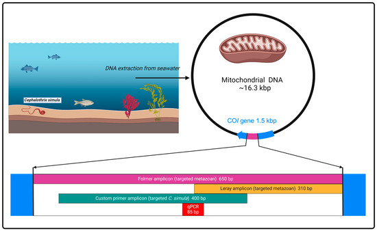 Graphical representation of four primer sets used in this study and relative position of their amplicons within COI gene of mitochondrial plasmid DNA. Folmer and Mini COI assays targeted all metazoan organisms, while custom assays targeted Cephalothrix simula. The figure was created with BioRender.com.