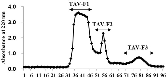 The active properties of TAV were isolated using a slight modification of a previous study [61]. The hydrolysate was dissolved in distilled water and loaded onto a Sephadex G-10 gel filtration column (2.5 × 100 cm) equilibrated with distilled water. The elution was performed in each 10 mL tube at a flow rate of 1.2 mL/min, and the elution peaks measured at 220 nm were freeze-dried for the next experiment.