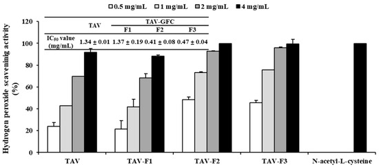 In a previous study, the DPPH and hydroxyl scavenging effects of the TAV showed IC50 values of 4 and 23 mg/mL, respectively [34]. Conversely, this study investigated the TAV at a significantly lower concentration for H2O2 scavenging activity. In addition, the antioxidant properties of the low-molecular-weight peptides were determined by measuring the IC50 values of TAV-F2 and TAV-F3, which were significantly lower than that of the TAV.
