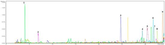 The efficacy of the separated peptides was evaluated to identify bioactive peptides with antioxidant properties. TAV-F2, which was preferred, considering its effects and yield, was analyzed using a Micro Q-TOF mass spectrometer as a fraction of the amino acid sequence. Nine main peaks were detected in the chromatogram (Figure 3), which corresponded to the following peptides: VAR, NYER, LGPY, VTPGLQY, QFPVGR, LGEW, QLQFPVGR, LDW, and NLGEW. To compare the efficacy of the fraction, peptides with the same sequence were synthesized to measure H2O2 scavenging activity (Figure 4 and Table 2). The H2O2 scavenging activity of the LGPY was 0.213 ± 0.010 mg/mL, which was the lowest IC50 value, and VAR, QFPVGR, and QLQFPVGR activity were not detected. The IC50 value of NYER exceeded 0.4 mg/mL, while the IC50 values of VTPGLQY, LGEW, LDW, and NLGEW were 0.297 ± 0.016, 0.289 ± 0.012, 0.363 ± 0.020, and 0.303 ± 0.001 mg/mL, respectively, which were lower than the IC50 value of TAV-F2. Previous studies have shown that the presence of tryptophan in functional peptides is closely related to antioxidant efficacy [35]. Additionally, C-terminus residues contribute to the improvement in the antioxidant ability of peptides containing aromatic amino acid Tyrosine, and the presence of Leucine in the N-terminus has also been reported to have antioxidant efficacy [36]. The average concentration of AV-derived bioactive peptides isolated using different protocols has been reported to be 0.611 mg/mL [37]. The bioactive peptides derived from TAV-F2 presented a clear scavenging effect and may serve as a factor that allows for the utilization of the TAV as an antioxidant source for bioactive peptides from fishery by-products [38,39].