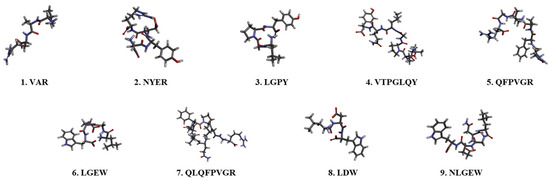 Therefore, this study evaluated the ACE-inhibitory effects of bioactive peptides derived from TAV-F2 through in vitro analysis to investigate their dual effects. The ACE inhibition activity IC50 values are listed in Table 3. Except for LGPY and LDW, the peptides of IC50 values were VAR (0.104 ± 0.010), NYER (0.107 ± 0.004), LGEW (0.165 ± 0.011), and NLGEW (0.146 ± 0.009 mg/mL). QLQFPVGR showed the best efficacy with a value of 0.004 ± 0.001 mg/mL, followed by VTPGLQY and QFPVGR at 0.023 ± 0.001 and 0.023 ± 0.003 mg/mL, respectively. The ACE inhibitory efficacy of the isolated seahorse-derived bioactive peptides was measured via comparable protocols for IC50 values of 0.088–0.171 mg/mL in an in vitro study [40]. Through comparison with these results, the inhibition efficacy of QLQFPVGR, VTPGLQY, and QFPVGR was confirmed.