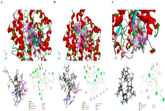 The prediction of the binding site of ACE-bioactive peptide complexes. The ACE-bioactive peptide complexes are shown by favorable hydrogen bond interactions at specific points and represented as stick models of residues with amino acid names and 2D diagrams of the binding complex. QLQFPVGR (A), VTPGLQY (B), and QFPVGR (C) are shown. The amino acid interaction in the active site pockets S1 and S2 are marked in red and blue, respectively, while the amino acid interaction in the zinc ion binding is marked in pink.